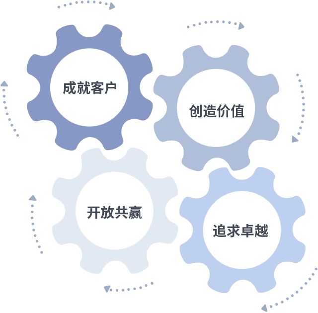 成就客户是一切决策的出发点,,,,创造价值是衡量所有工作的标准,,,,追求卓越是我们做事做人的态度,,,,开放共赢是我们的格局也是最终的结果。。价值观的齿轮环环相扣,,,推动着组织里的每个人不断向前。。。。